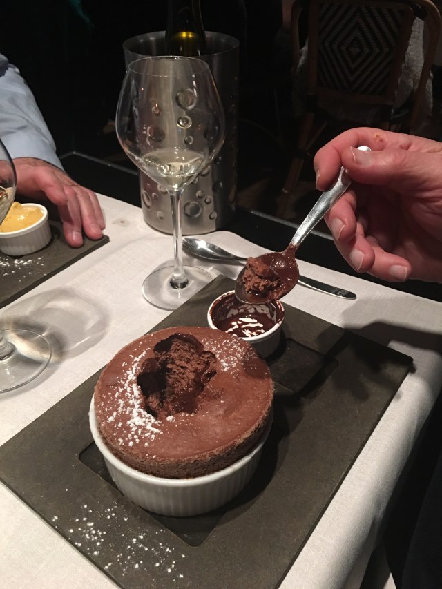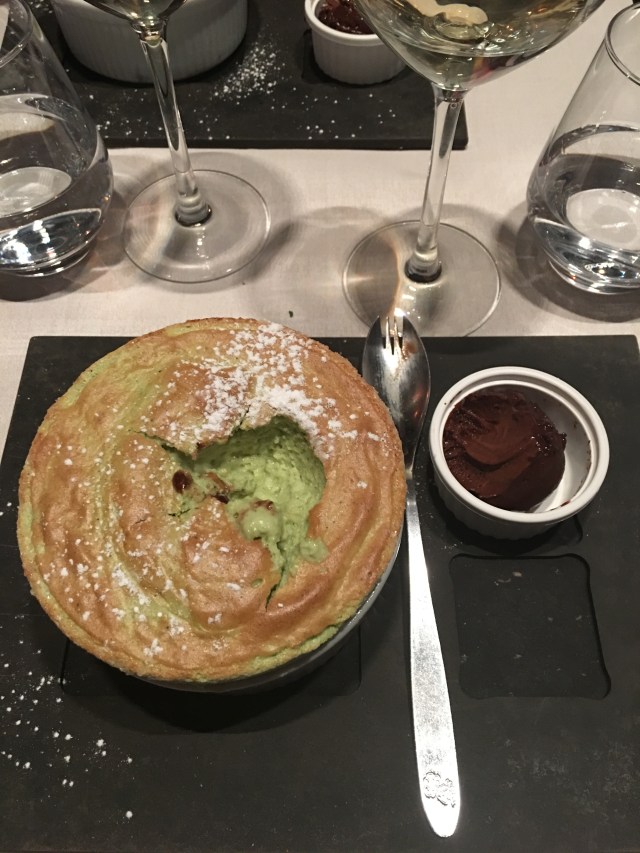 After a morning of doing sheets and towels we headed downstairs to meet friends for lunch at La Cigale Recamier a must for us when in Paris. We haven’t had a croissant yet, but we can’t go home without a soufflée. We have the same main course every time (mushroom soufflee) and usually the chocolate one for dessert. This time I had pistachio with chocolate sauce (almost an ice cream) which was wonderful.