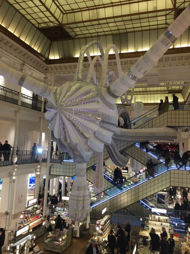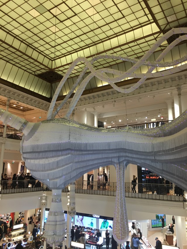 From there we walked two blocks over to the Bon Marche where I thought I might find a fun scarf for my self. Well I didn’t find anything I really liked but almost bought a fun muffler of faux fur. It had a snazzy purse inside which I thought was clever. However, at a 1000 euros I passed on it. We were taken by the fantastical installation throughout the interior which was also continued in the display windows. I tried to capture this white monster floating through the air as best I could. There is a short blurb about the artist at the end.