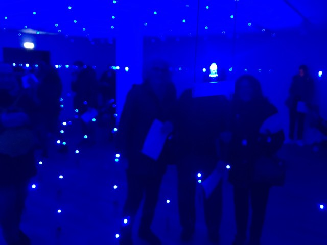 After that we stopped in next door at the EDF gallery. EDF is France’s electric/gas company. From time to time they have special exhibits and so there was one in progress called Light Matters. The exhibition room was totally dark, lit only by hundreds of tiny lights hanging from wires. The lights changed color.