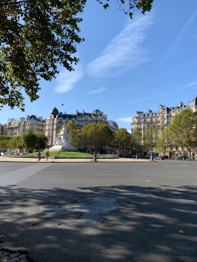 With our backs to Les Invalides we see the Place de Breteuil — a wide traffic circle usually bustling with lots of traffic and cyclists, but today, rather quiet. I think everyone is out walking.