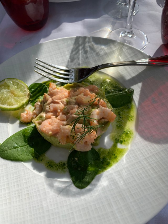 For an appetizer I ordered avocado with shrimp — with an avocado oil and dill. It was delicious. I will try to replicate it if I can find a recipe for it.