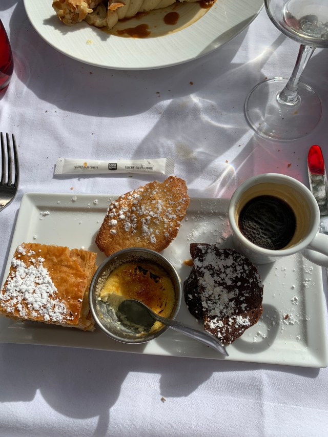 On to dessert — above George’s mille feuille, and below, my cafe Gourmand — a small creme brulee, a small mille feuille, a madeline, and a cake oozing with chocolate.