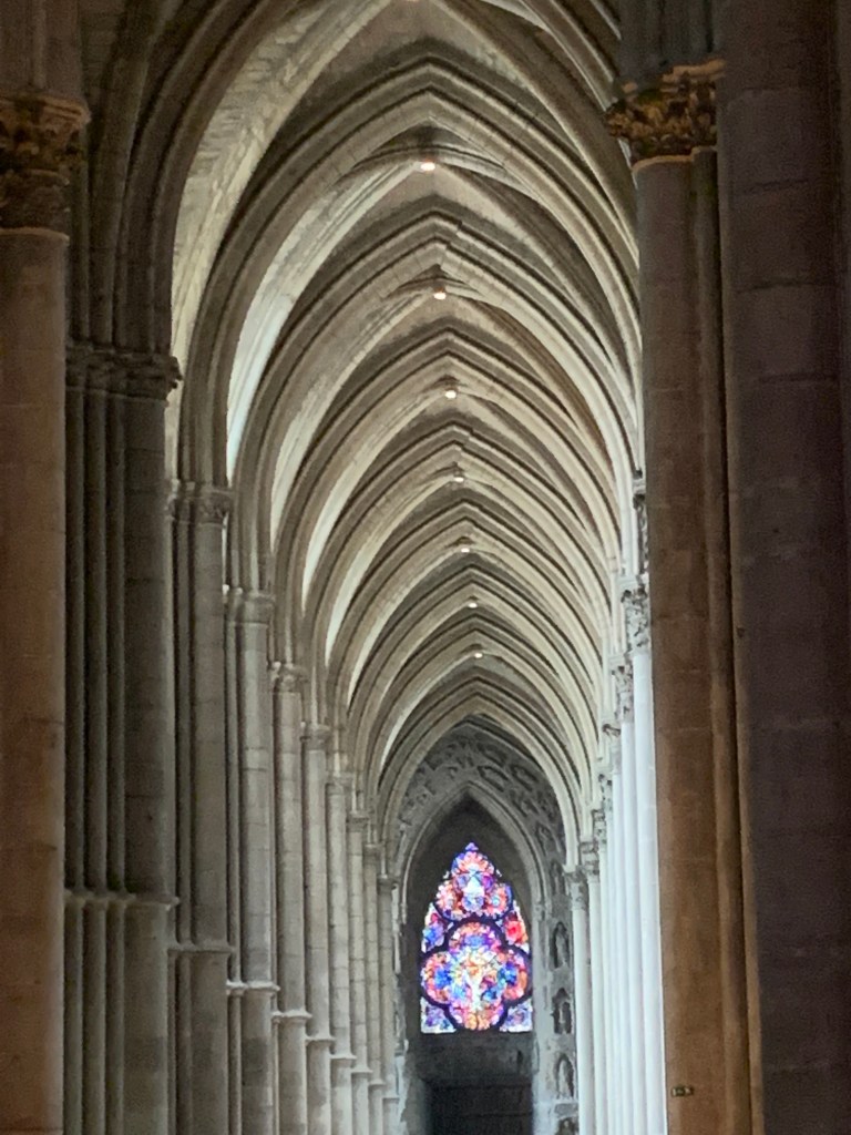 We all learned in school about the incredible Gothic cathedrals of France. This is one of the greatest where all of the kings of France were crowned. (Rheims = the English spelling, so don’t get confused). In person – it is truly dazzling. My photos don’t do it justice at all. Saturday night we had dinner at a restaurant, 3rd floor above ground, with the cathedral as our backdrop. The Rose Windows are breathtaking as are the 3 stainglasss windows by Marc Chagall. (Worth going online to read about the stain glass windows. Several are intact from the 13th century having survived both World Wars.