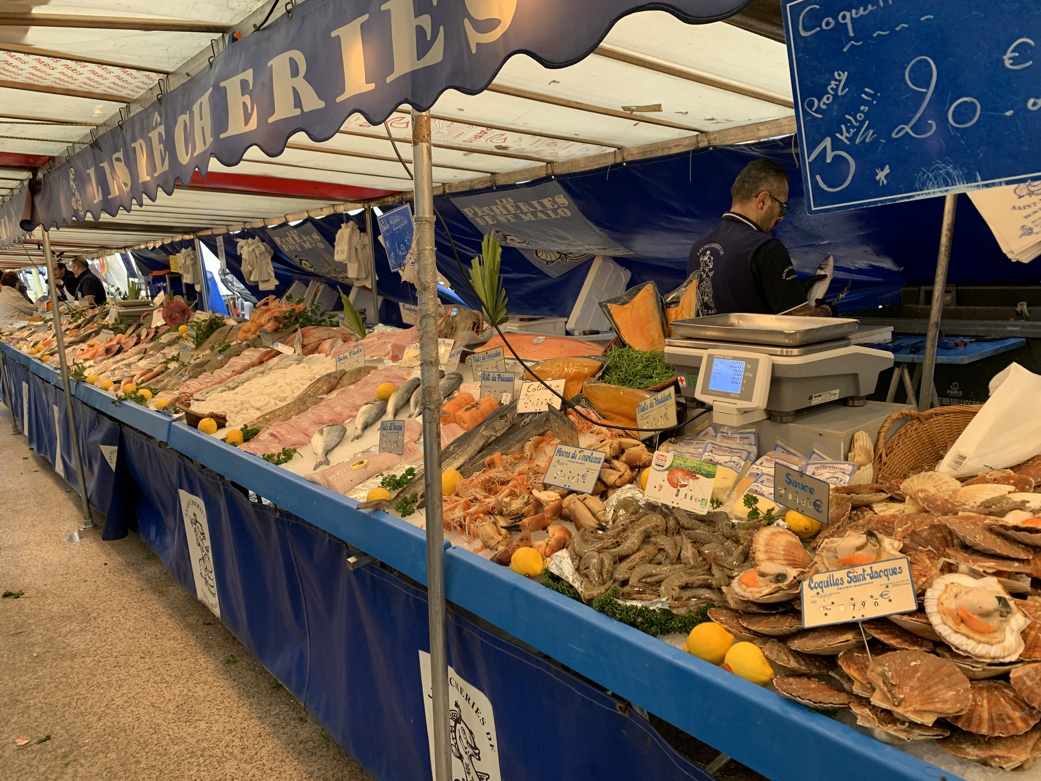 The next day I was awake enough to get down to the market to do some shopping. As I’ve reported in the past, these street markets are mind-boggling in the variety of fresh produce, fish, meats, cheeses, and prepared foods available. Vendors from various regions come with the products they produce – cheeses, breads, wines, fruits to mention some of what they bring. Even on the Cape we don’t see the variety of fish displayed here. And how about the potatoes? How many different kinds there are – and each has its specific use depending on the dish being prepared. (That’s about all I know!)