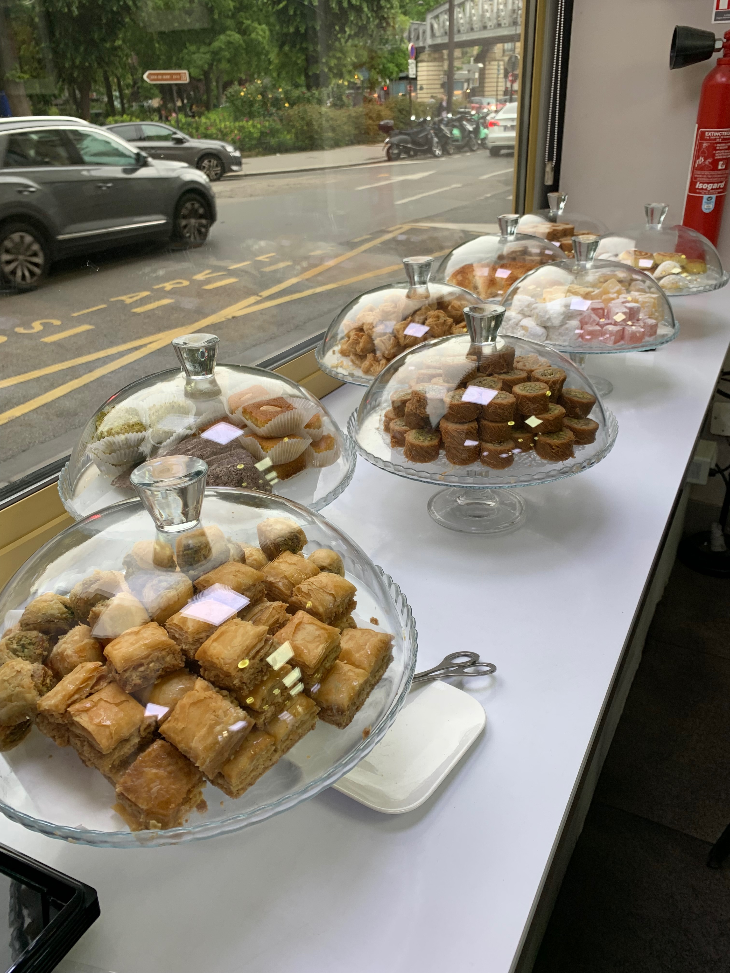 We arrived on Thursday and slept until early afternoon on Friday. Wanting to get out and walk a bit we made our way down to a Lebanese grocery where we picked up some authentic Armenian lavash (paper thin sheets of bread) that we cannot get in the U.S., Feeling a bit hungry we sat down to a plate of appetizers all prepared right there. No — we did not eat any of the pastries. It would be too soon to give into that — too many croissants and French pastries are still ahead. Just opposite the restaurant you can see a garden and park on that busy corner. There is a statue of a lion growling in the middle of it. Next time I’ll walk over to see what it signifies, if anything.
