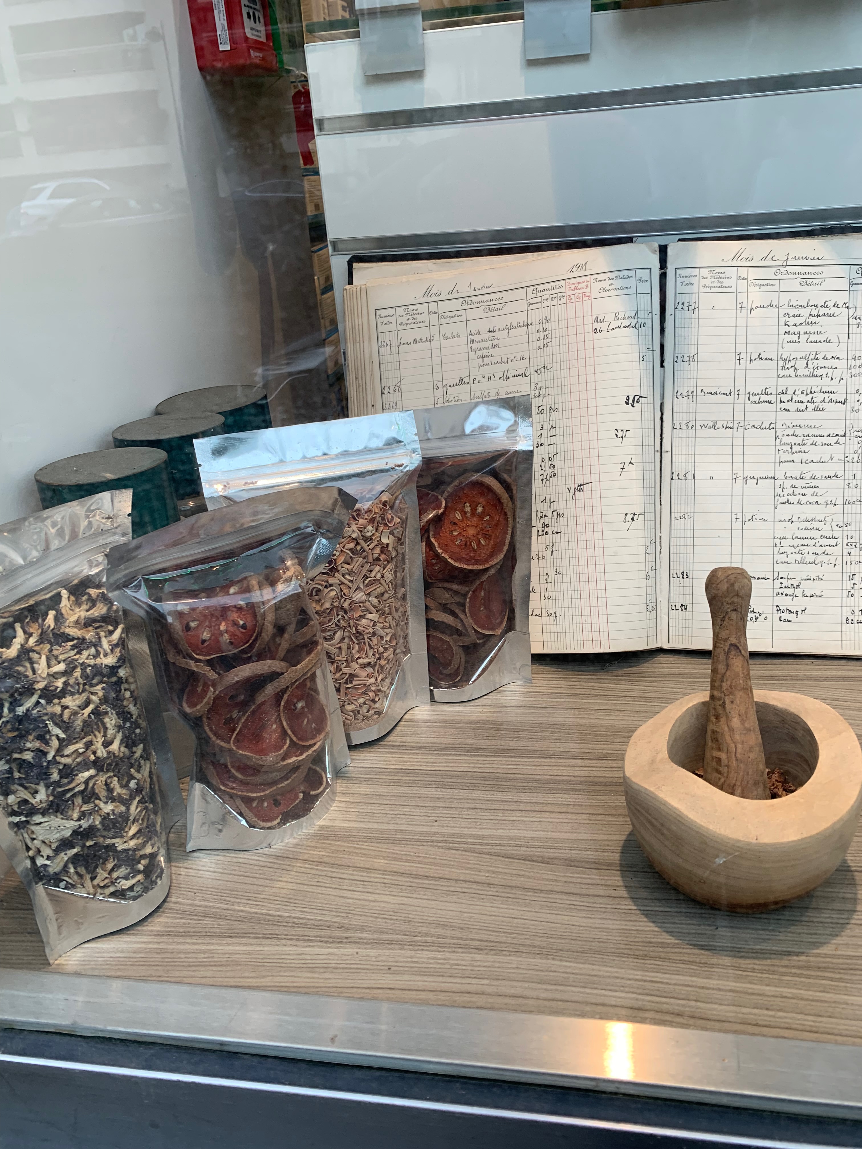 I bit further down the street we passed a pharmacy that also sells herbs and alternative medicines. This was the window display. I have no idea what these herbs are. The ledger I assumed was from times passed.