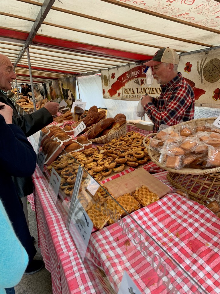Below is our bread man. He knows George and me well and never fails to give a warm welcome. Today he asked about George not seeing him around. I bought two baguettes and a lemon pound cake. Over the next three hours he will sell almost everything you see in the photo.