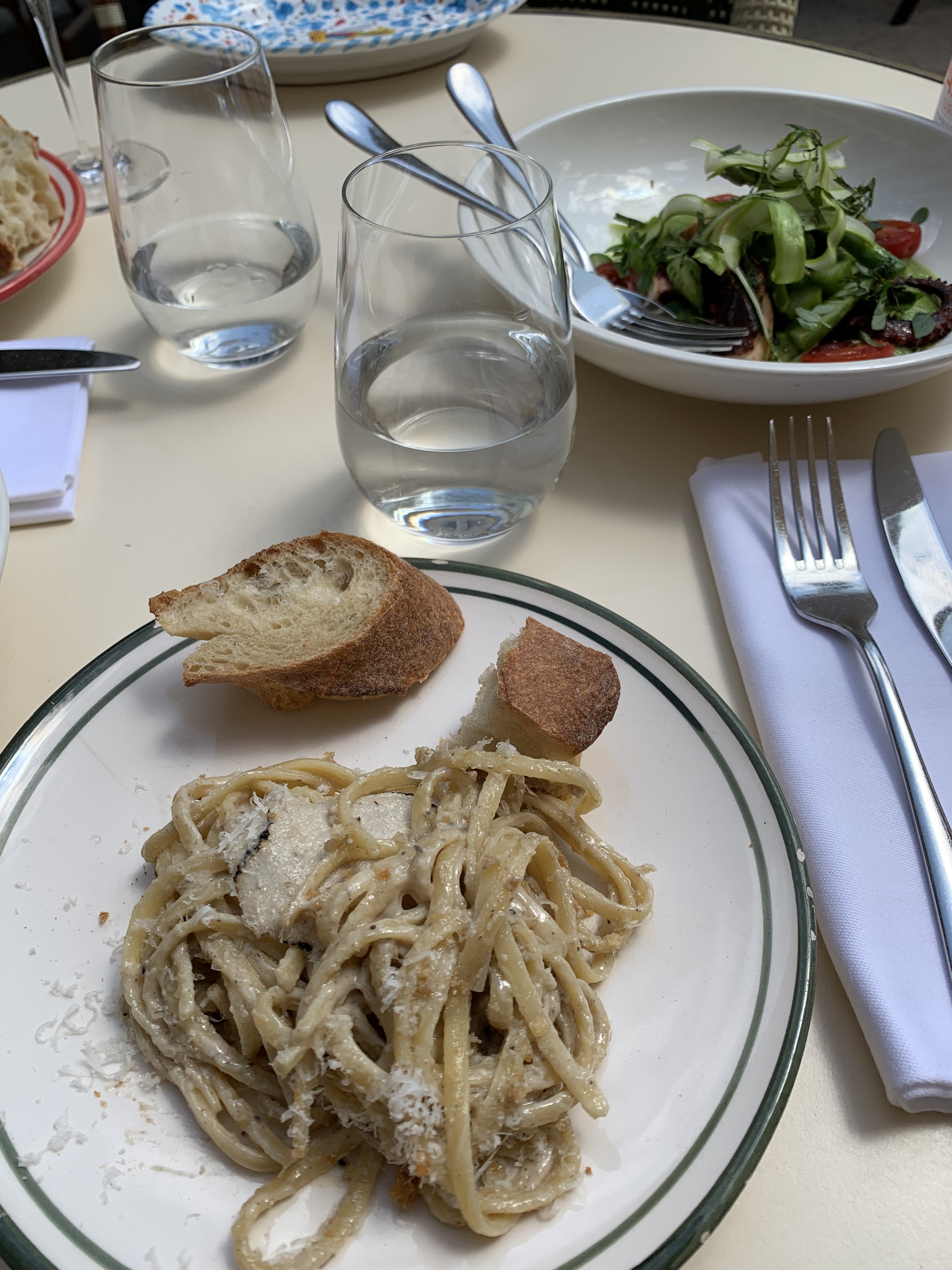 Squid salad to start followed pasta. with thinly sliced truffles. We shared both dishes. They were delicious.