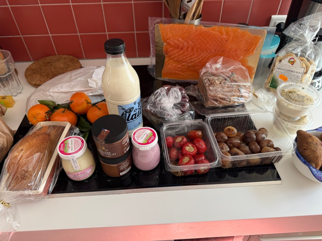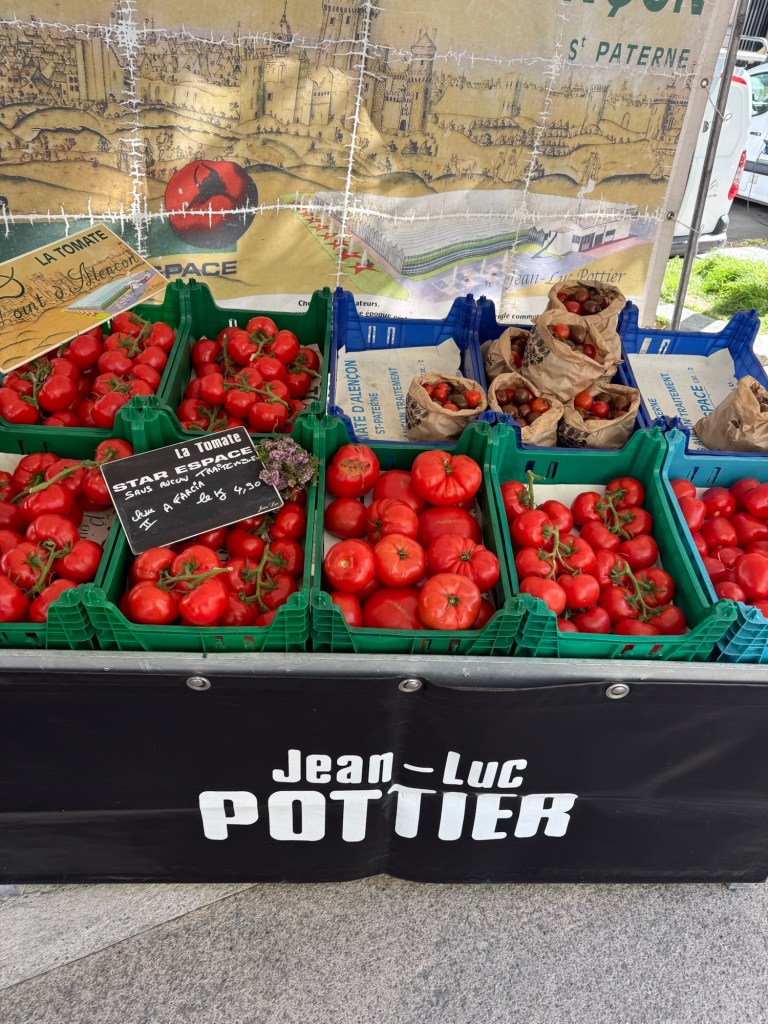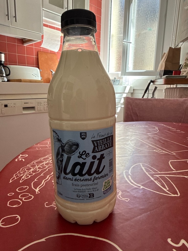 Back in the kitchen – fresh milk from the “Vielle Abbaye” – the old Abbey and good for the heart. Although the fat content isn’t listed it is supposedly “half crème”. I also bought little pots of chocolate mousse from this same vendor — one was shared after lunch. Soooo good!