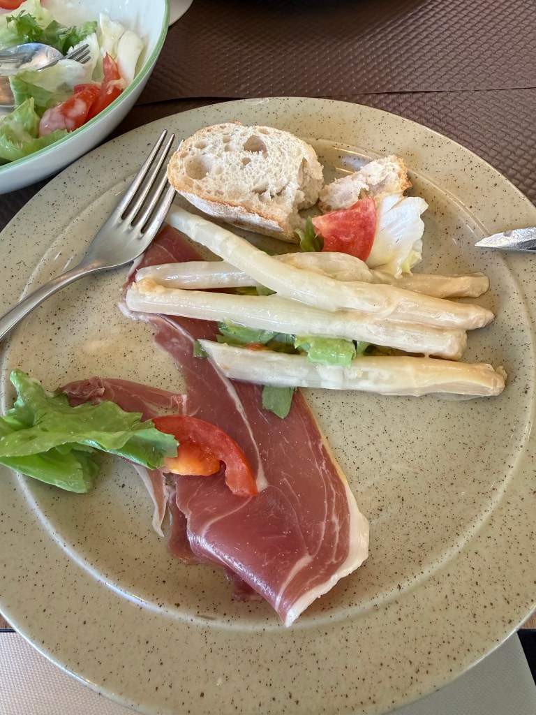 Our. Dinner started with an appetizer of white asparagus and prosciutto which we shared. Followed by a flat steak smothered in onions and fries ( I asked for mashed but they didn’t have any)