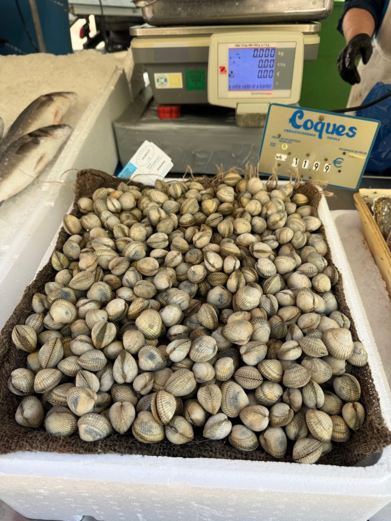 I headed over to the fish vendor for a slab of smoked salmon and saw these small shell fish that I didn’t buy but might next week just to see what they are.